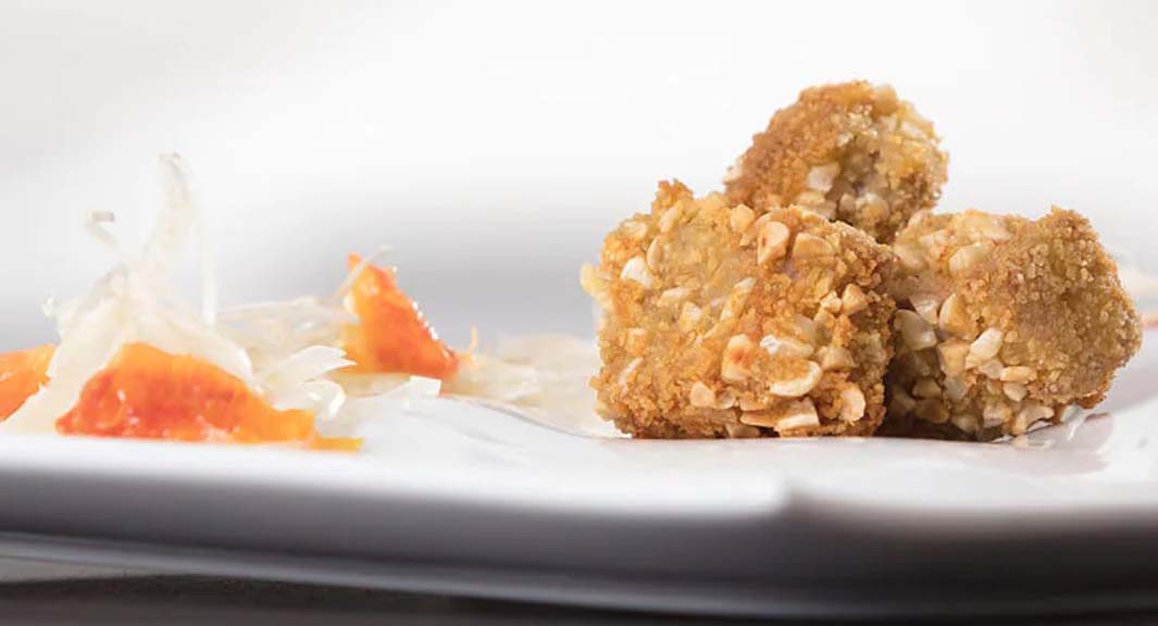 1. Пригответе панировката, като сложите парче в брашното, след това в яйцата и накрая в галетата с натрошени бадеми.