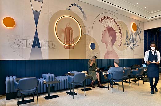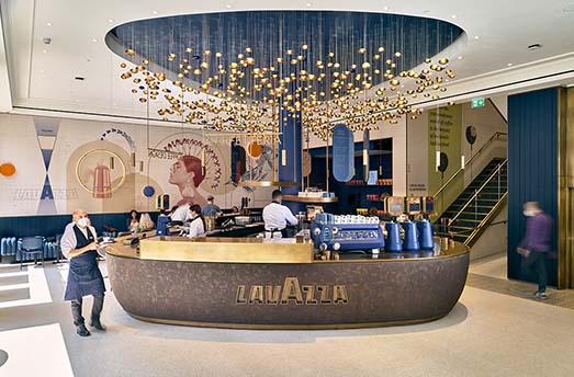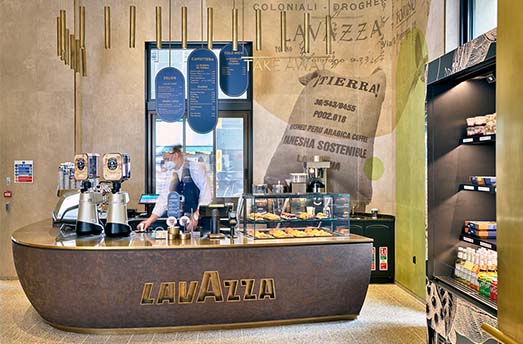 Lavazza винаги се е ангажирала с популяризирането на автентичните традиции на италианското кафе, като същевременно държи под око бъдещето и иновациите. За тази цел Lavazza проектира съвременен концептуален магазин с предложения от известни дизайнери за уникално потребителско пътуване. Зоните Caffetteria, Grocery и Takeaway на приземния етаж, заедно с Gastronomia, ресторант на първия етаж, се съчетават, за да осигурят 360° кафе изживяване.