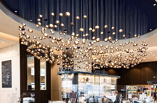 Топли и привлекателни тонове, придружени от отблясъци на злато, бронз, калай и сребро, които подчертават детайлите с допълнителни проблясъци на синьо. Дизайнът и обзавеждането са замислени така, че да превърнат изживяването в магазина в едно чудно пътешествие, като го направят още по-завладяващо.