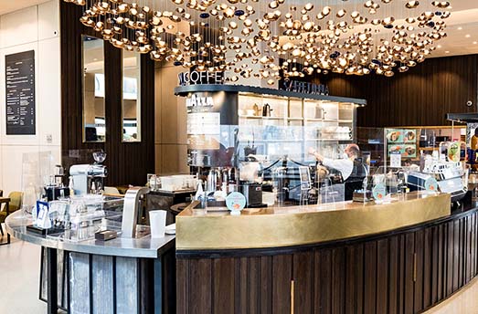 Централен плот разделя четирите свързани зони. Стилът и цветът подчертават естествените материали, и са увенчани с ефектна корона, която подчертава магията на кафето.